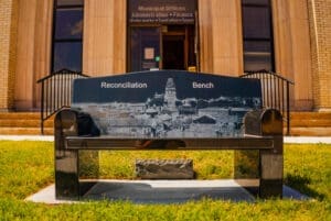 Johnson foreshadowed in Damaged Heritage neighboring communities to the Elaine Massacre Memorial creating perpetual, physical memorials that acknowledge inherited racial acts of violence and brutal racial murders that were part of the histories of those communities. Monticello, Arkansas, Johnson’s hometown, became a first to follow Johnson’s proposal with the creation of the Memorial Reconciliation Bench, located in front of the town’s City Hall and dedicated to the memory of two simultaneous murders – one Black man and one white man, a deputy sheriff with racially progressive views, murdered by 14-15 Ku Klux Klansmen soon after the Civil War with the bodies left in an embrace to rot in the sun.